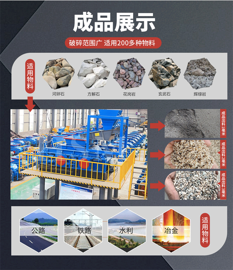 河卵石、方解石、石英、玻璃、大理石、鵝卵石、膨潤土、鐵礦石、青石、山石、石灰石、風化砂、輝綠巖、花崗巖、玄武巖等物料的破碎制砂工作。